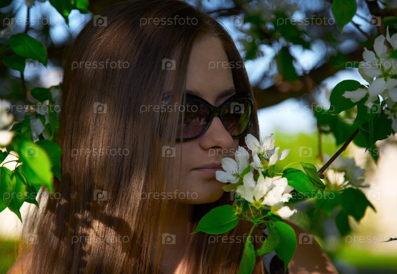 Девушка нюхает цветущую яблоню