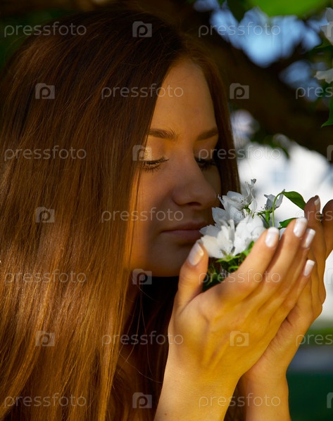 Девушка нюхает цветущую яблоню