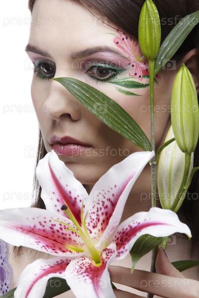 Красивая девушка, с элементами боди-арта на лице, позирует с лилией