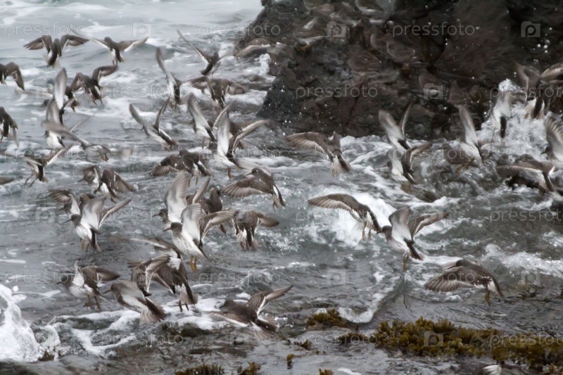 Стая берингийских песочников летают у морского берега