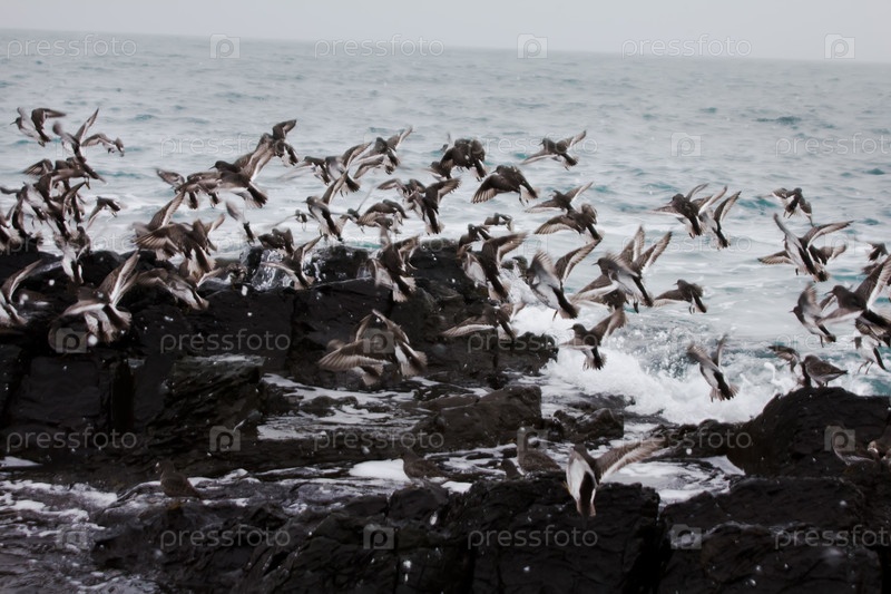Стая берингийских песочников летают у морского берега