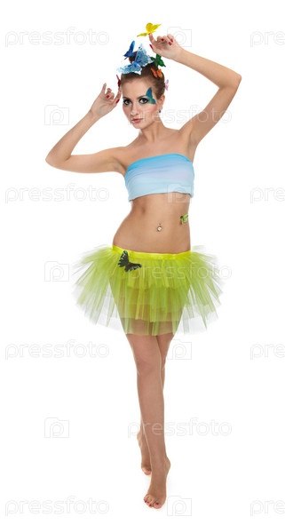 Девушка в костюме феи с желтой бабочкой на руке
