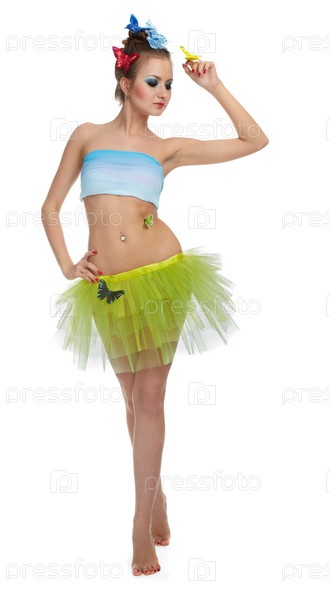 Девушка в костюме феи с желтой бабочкой на руке