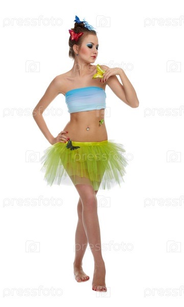 Девушка в костюме феи с желтой бабочкой на руке