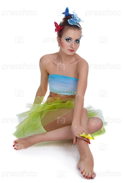 Девушка в костюме феи с желтой бабочкой на руке