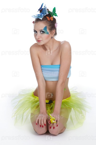 Девушка в костюме феи с желтой бабочкой на руке