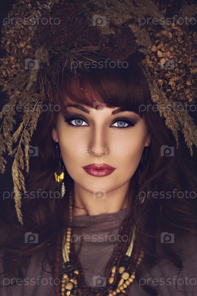 Красивая молодая женщина с сухими цветами на голове