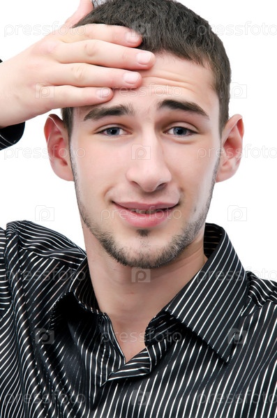 Мужчина с головной болью. Изолирован на белом фоне