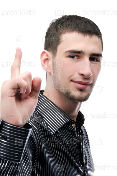 Молодой счастливый мужчина показывает пальцем вверх, изолирован на белом