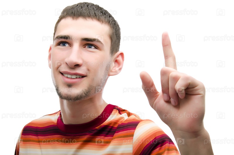 Молодой счастливый мужчина показывает пальцем вверх, изолирован на белом
