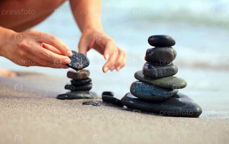 Человек складывает пирамидку из камней на пляже