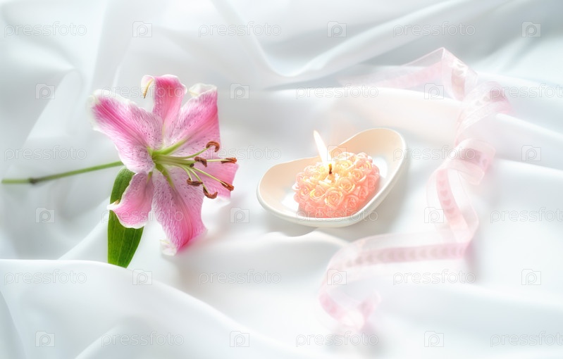 Свеча из розочек в форме сердца и лилия на белой ткани