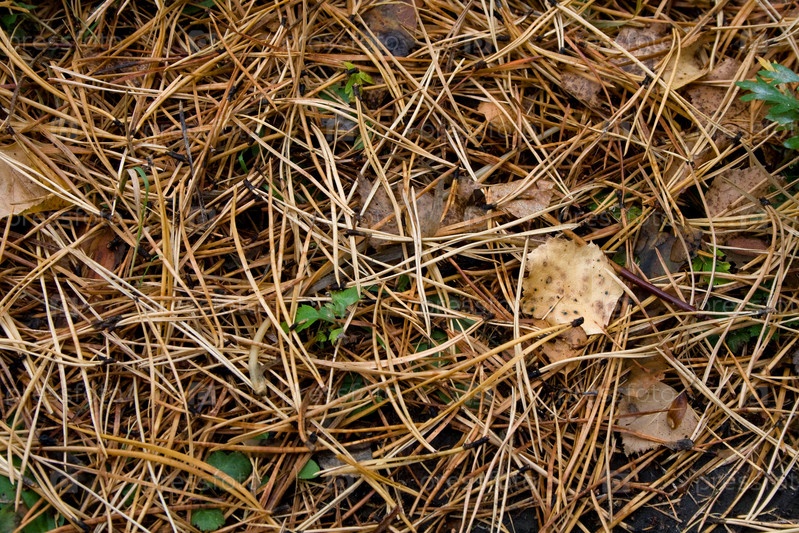 Текстура земли, покрытой сосновыми иглами и березовыми листьями.Где-то видна зеленая трава