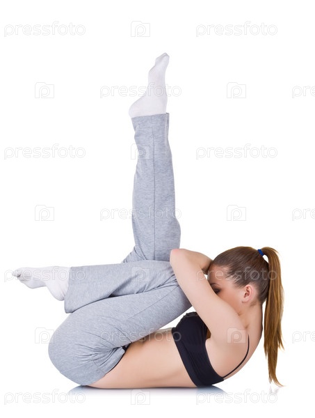 Девушка на белом фоне делает гимнастику