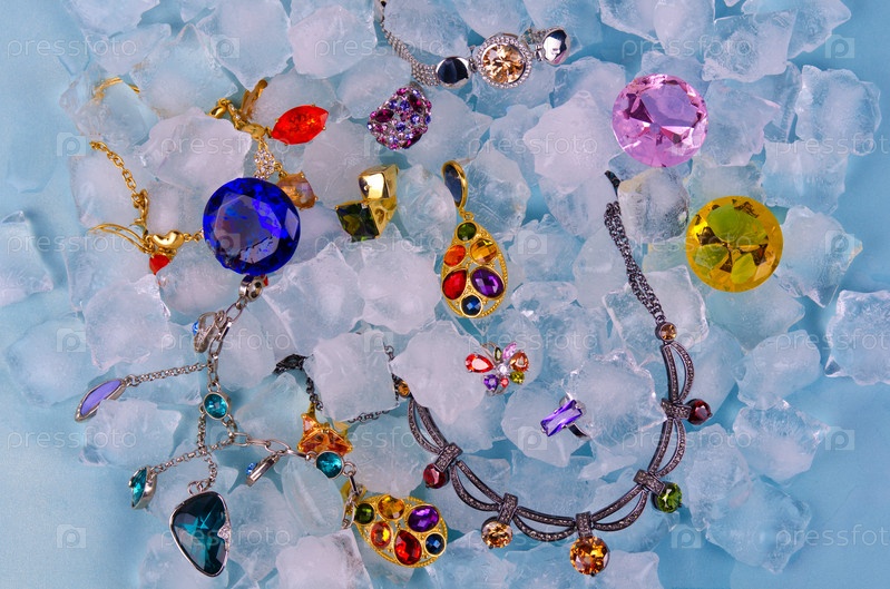 Украшения лежат на кубиках льда