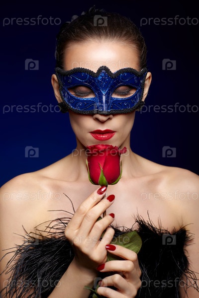 Портрет молодой женщины в карнавальной маске и с красной розой