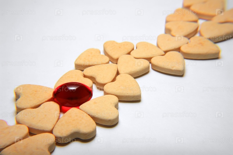 Таблетки в виде сердец и красная капсула на белом фоне