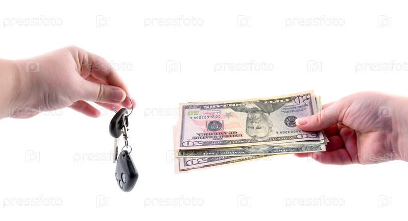 Руки с деньгами и автомобильными ключами, на белом фоне