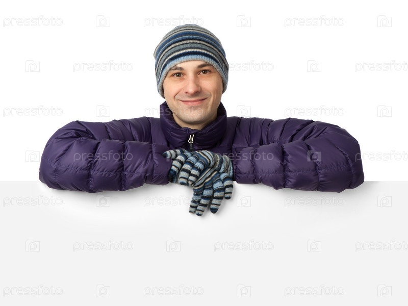 Молодой мужчина в зимней одежде с пустым баннером