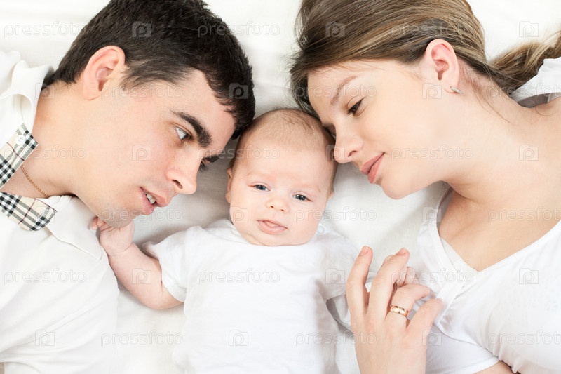 Счастливый семейный дом: отец, мать и ребенок лежат на кровати и играют