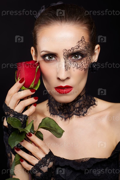 Портрет молодой женщины с красной розой и элементом боди-арт на лице