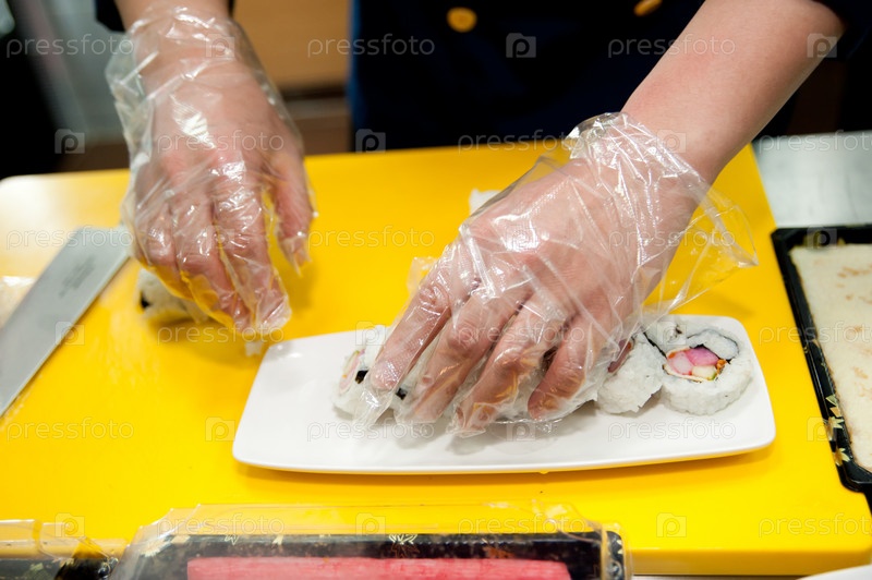 Руки повара нарезают роллы
