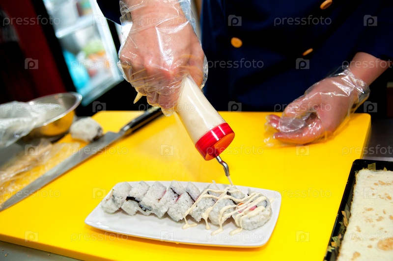 Повар готовит роллы