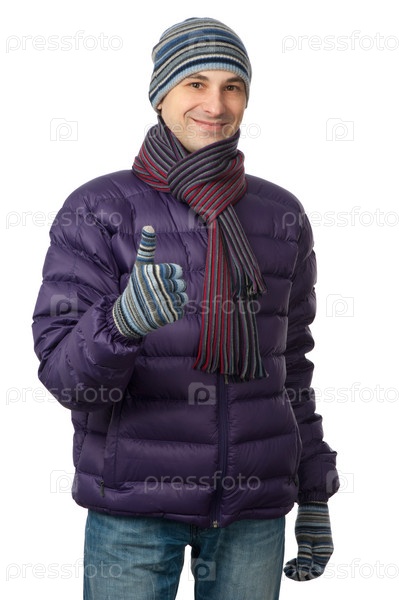 Молодой мужчина в зимней одежде на белом фоне