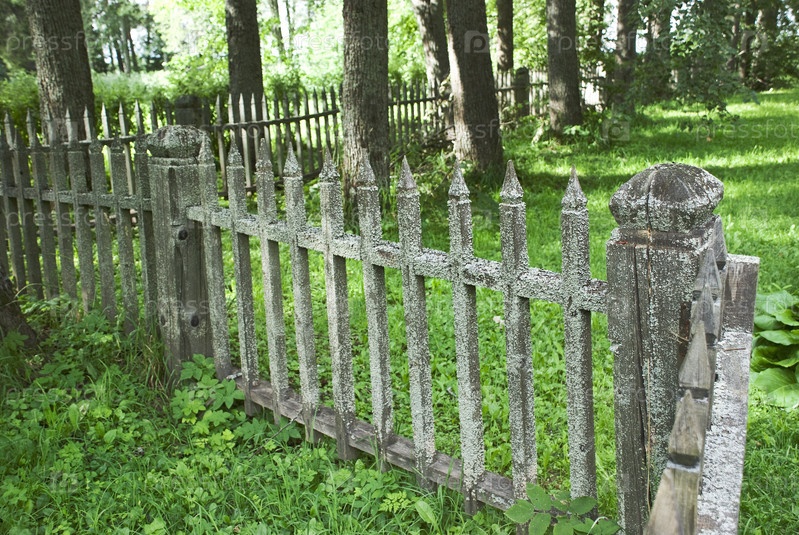 Деревянный забор, парк с зеленой травой летом