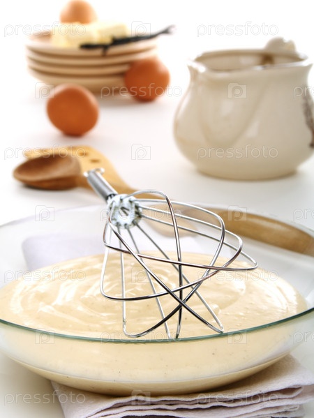 Венчик и ванильный соус в стеклянной тарелке на столе