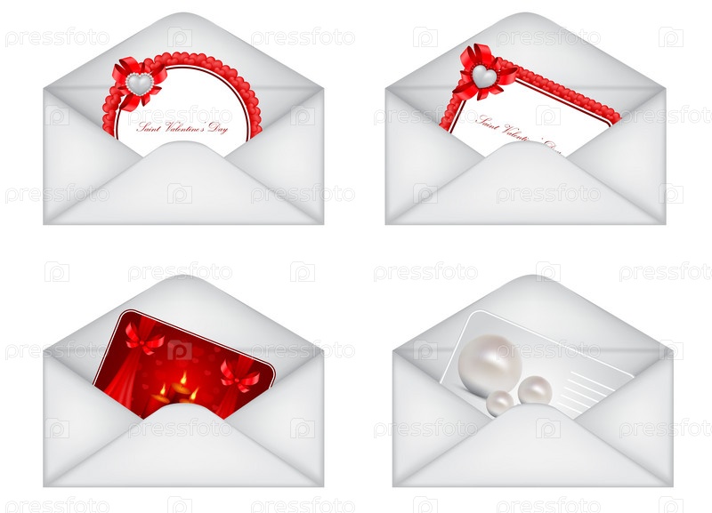 Четыре конверта с разными открытками, иллюстрация на белом фоне