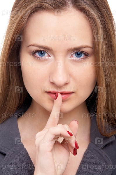 Женщина приложила палец к губам, изолировано на белом фоне