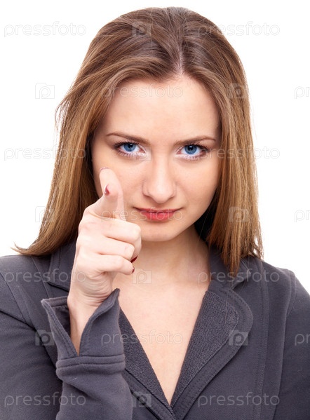 Женщина показывает пальцем в камеру, изолировано на белом фоне