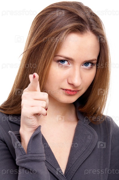 Женщина показывает пальцем в камеру, изолировано на белом фоне