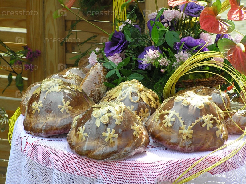 Украшенные караваи на столе