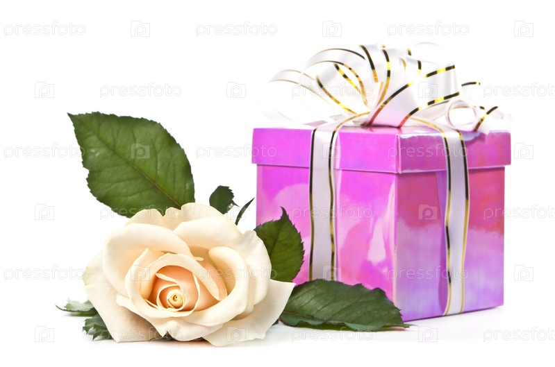 Подарок и роза на белом фоне