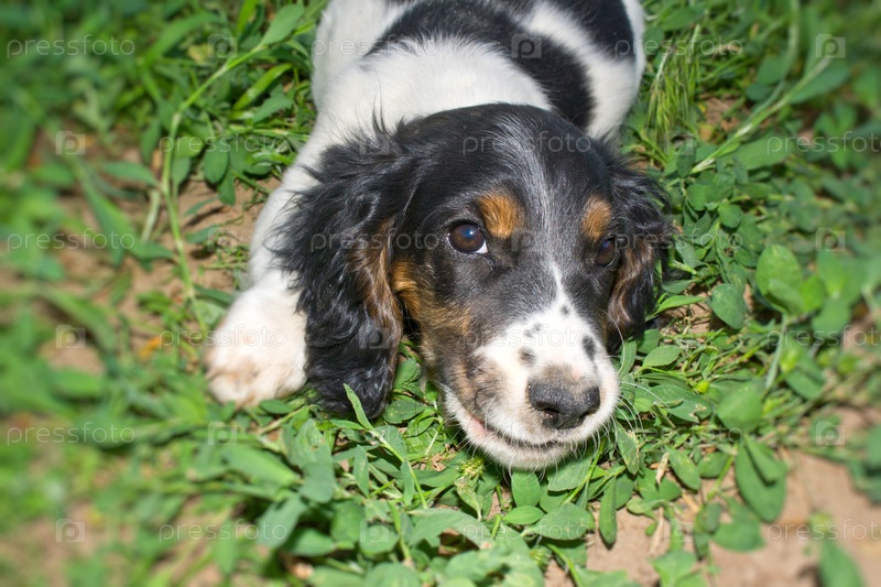 Щенок спаниеля лежит на траве и смотрит вверх