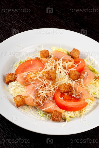 Салат из китайской капусты, чеснока, сыра пармезан, соуса и копченого лосося