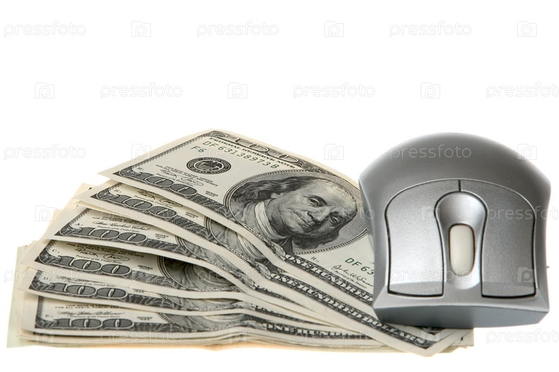 Стодолларовые купюры и компьютерная мышь на белом фоне