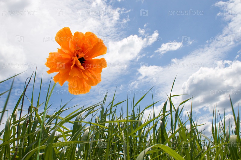 Оранжевый мак и зеленая трава на фоне неба