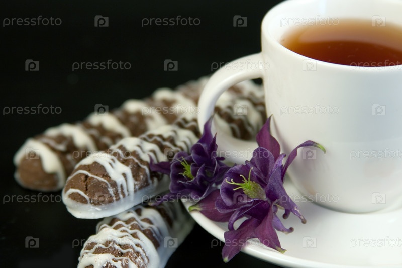 Чашка чая, печенье и цветы на черном фоне