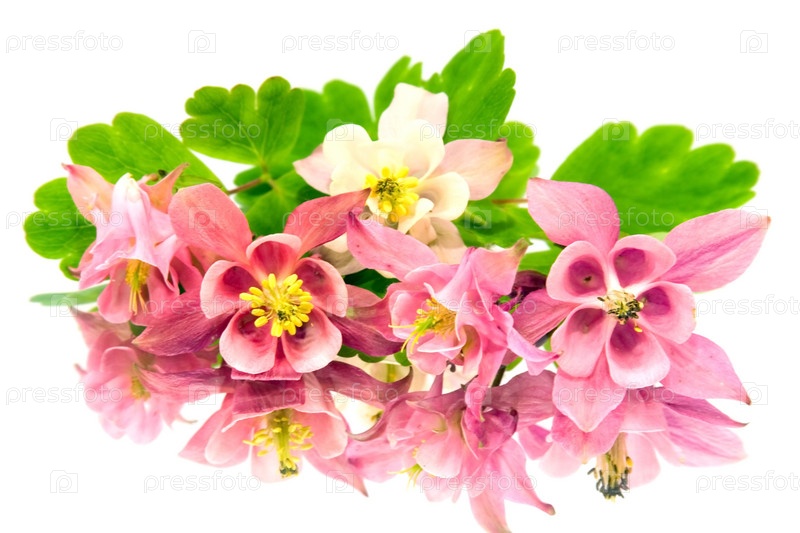 Розовые цветы водосбора с листьями и их отражение на белом фоне