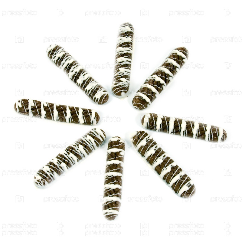 Полосатое печенье лежит в форме солнца на белом фоне
