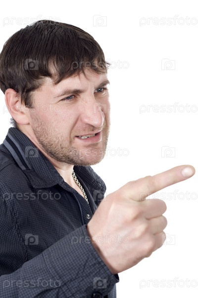 Мужчина показывает пальцем, изолировано на белом фоне