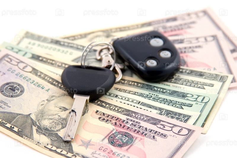 Ключ от автомобиля и доллары, изолировано на белом