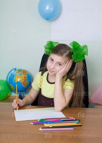 Девушка, сидящая за столом с цветными карандашами