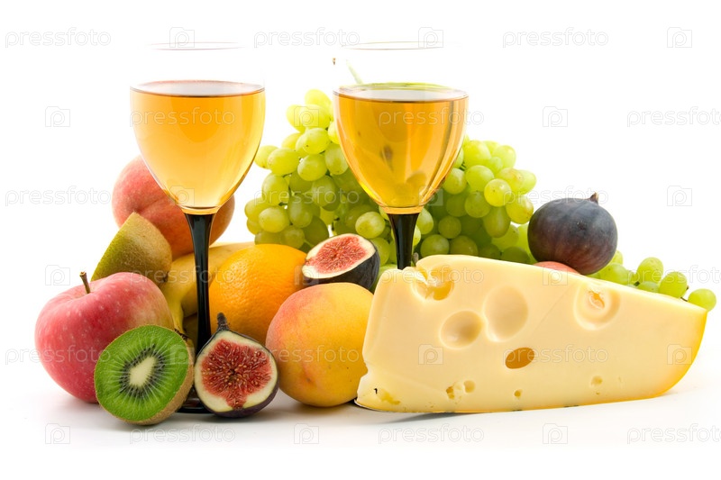 Вино, сыр и фрукты, изолировано на белом