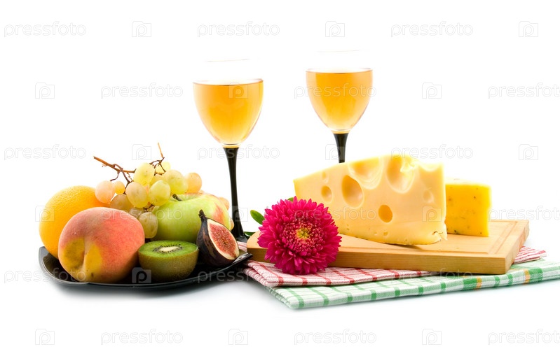 Вино, сыр и фрукты, изолировано на белом