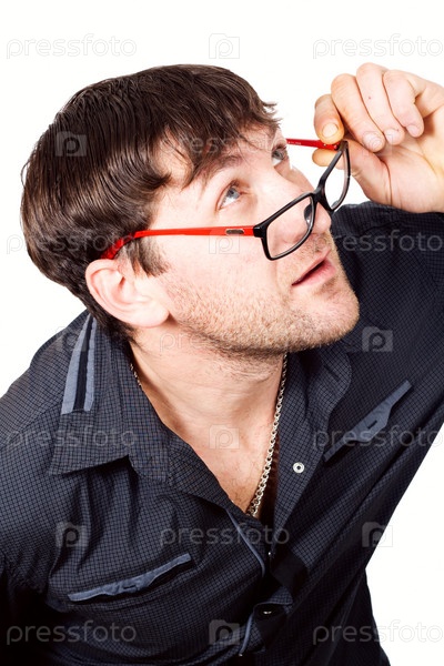 Мужчина в очках смотрит вверх