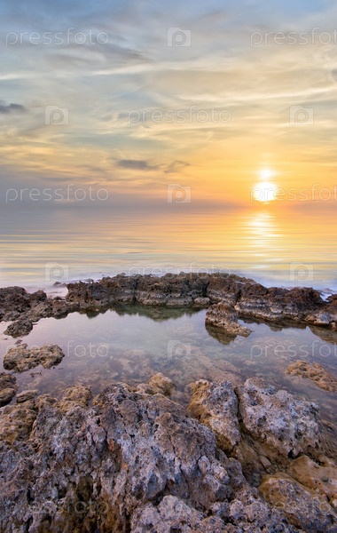 Каменистый морской берег на закате
